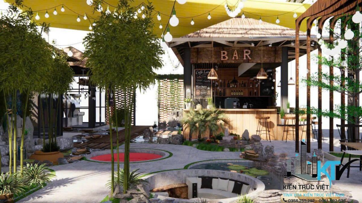 Quán cà phê được thiết kế theo phong cách sân vườn mở, lấy cảm hứng từ thiên nhiên với các yếu tố cây xanh, nước, và vật liệu mộc mạc như tre, gỗ, và mái lá. Mục tiêu chính là tạo ra một không gian thư giãn, thoáng đãng, mang đến cảm